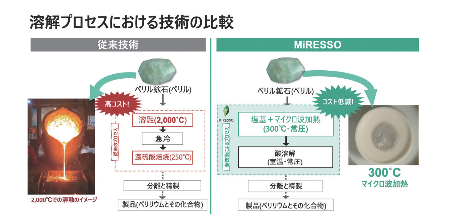 MiRESSO社は国立研究所の一つである量子科学技術研究開発機構(QST)発のスタートアップで、フュージョンエネルギーにおいて中核材料の一つである「ベリリウム(Be)」の分離・精製を行っています。ベリリウムは、アクアマリンやエメラルドと同じ鉱物種である「ベリル(緑柱石)」から抽出可能な元素です。従来技術では溶解工程で高温処理が必要ですが、MiRESSO社はマイクロ波を用いた低温での溶解技術を確立し、ベリリウムの低廉かつ安定した供給に貢献します。直近ではパイロットプラント(青森県八戸市にて2027年に稼働開始予定)の建設に向けて大型の資金調達も行いました。また、この溶解技術は蓄電用途で広く使用されるリチウムの分離・精製にも応用可能で、世界的に需要が高まるリチウムの供給における地理的な偏在という課題の解決に挑みます。2025年度のNEDO先導研究プログラムにも採択され、東京大学と共同で行うリチウム分離・回収技術の研究開発を進めるため、SICに入居することとなりました。