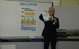 | 神奈川工科大学 廣田 武彦 様から産学交流プログラムの展示を紹介していただきました。 |