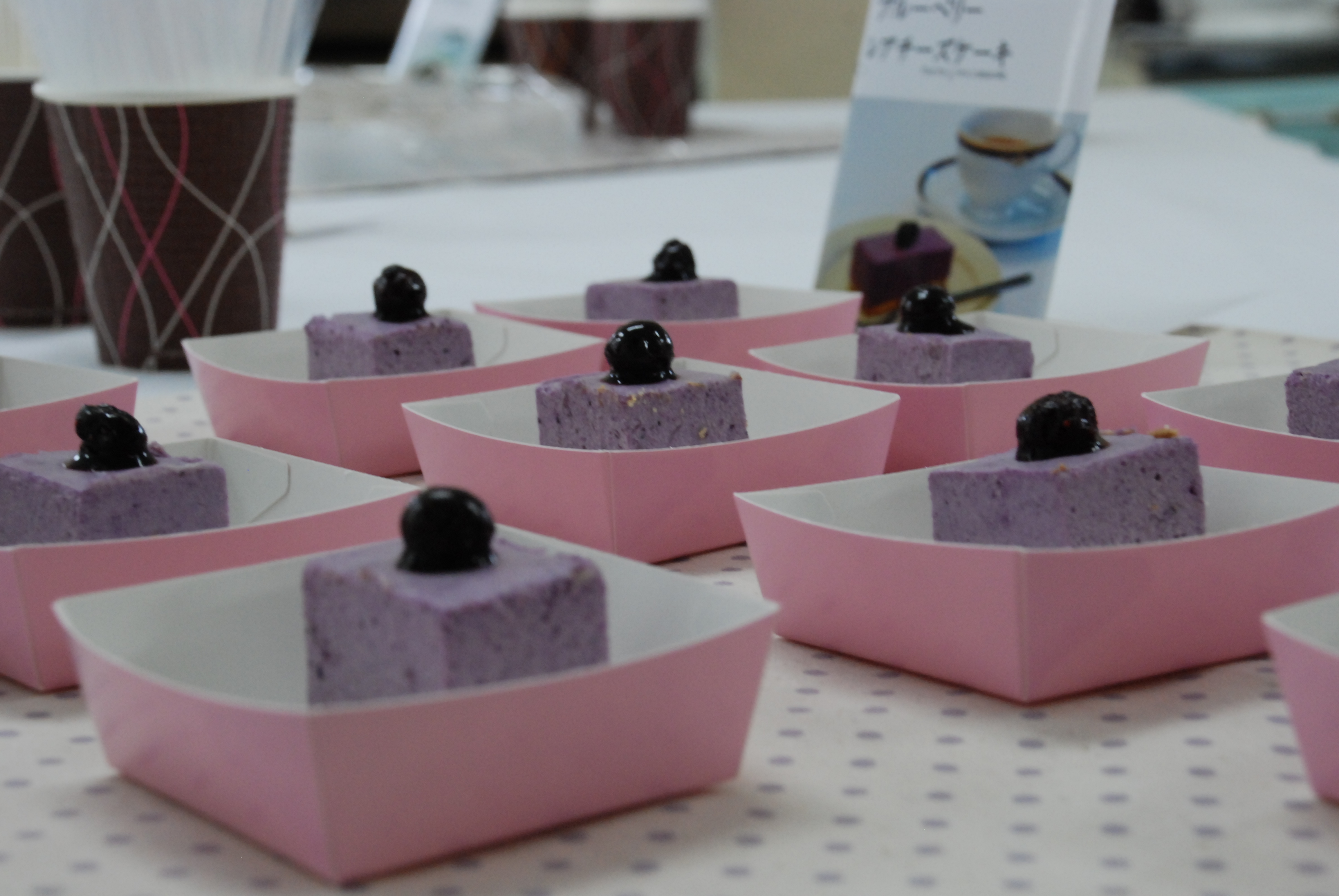 私も小冊子の完成披露&試食会に参加し、ブルーベリー大福、ブルーベリーそうめん、ブルーベリーの佃煮、ブルーベリーの巻き寿司、ブルーベリーゼリー、ブルーベリーレアーチーズケーキ、ブルーベリークッキーとおなか一杯試食してきました。 中でもブルーベリーの粒を丸ごと入れた大福は粒感が絶妙で、忘れられない美味しさでした。