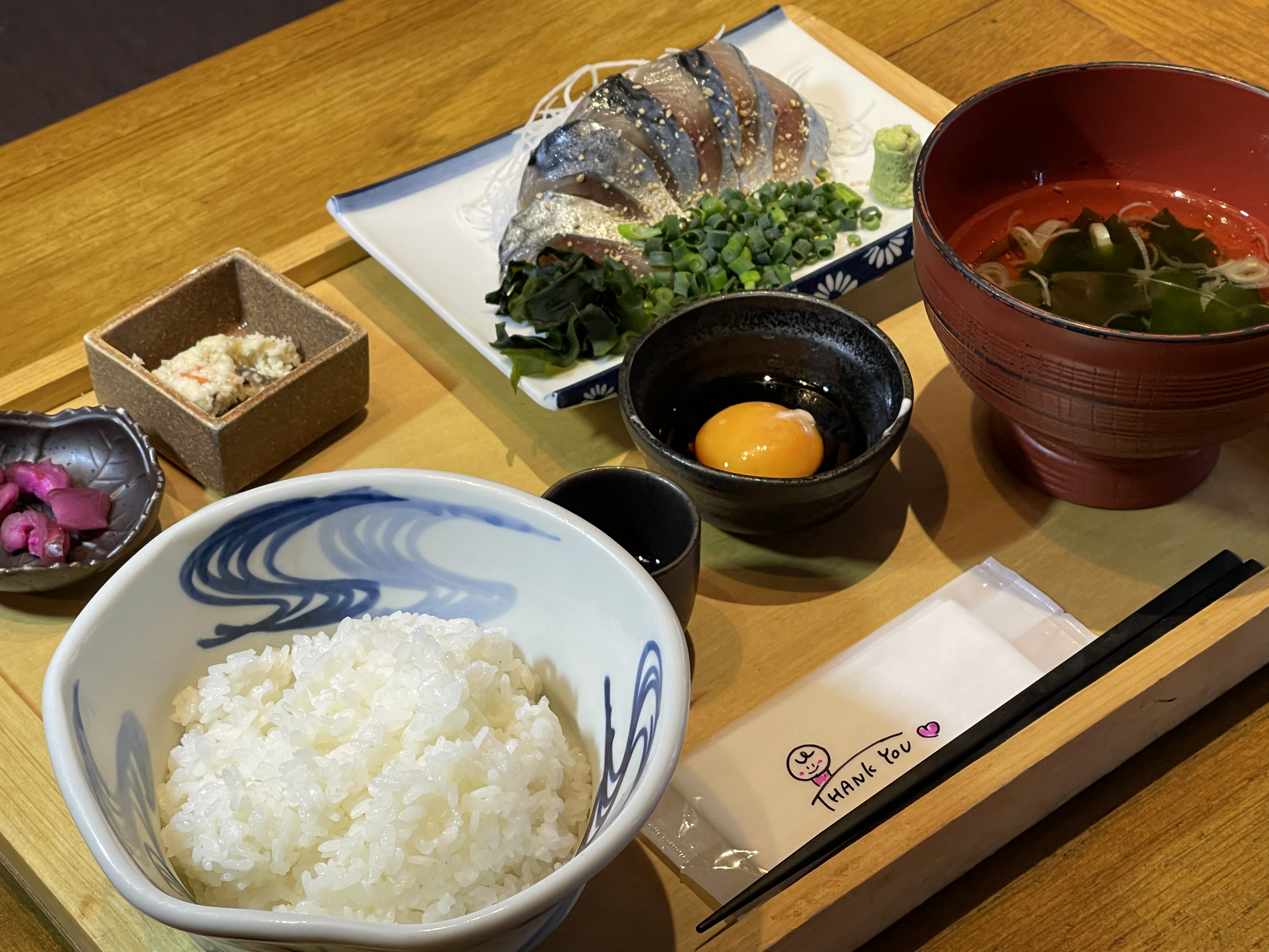 注文してすぐに全品が並び、唐揚げは、大きく柔らかい鶏肉4 個と山盛りの柔らかなキャベツ、ご飯とすまし汁、小鉢と漬物、そしてりんご酢が添えられています。ごまサバは、新鮮で厚みがある切り身に卵とタレが絶妙に合います。