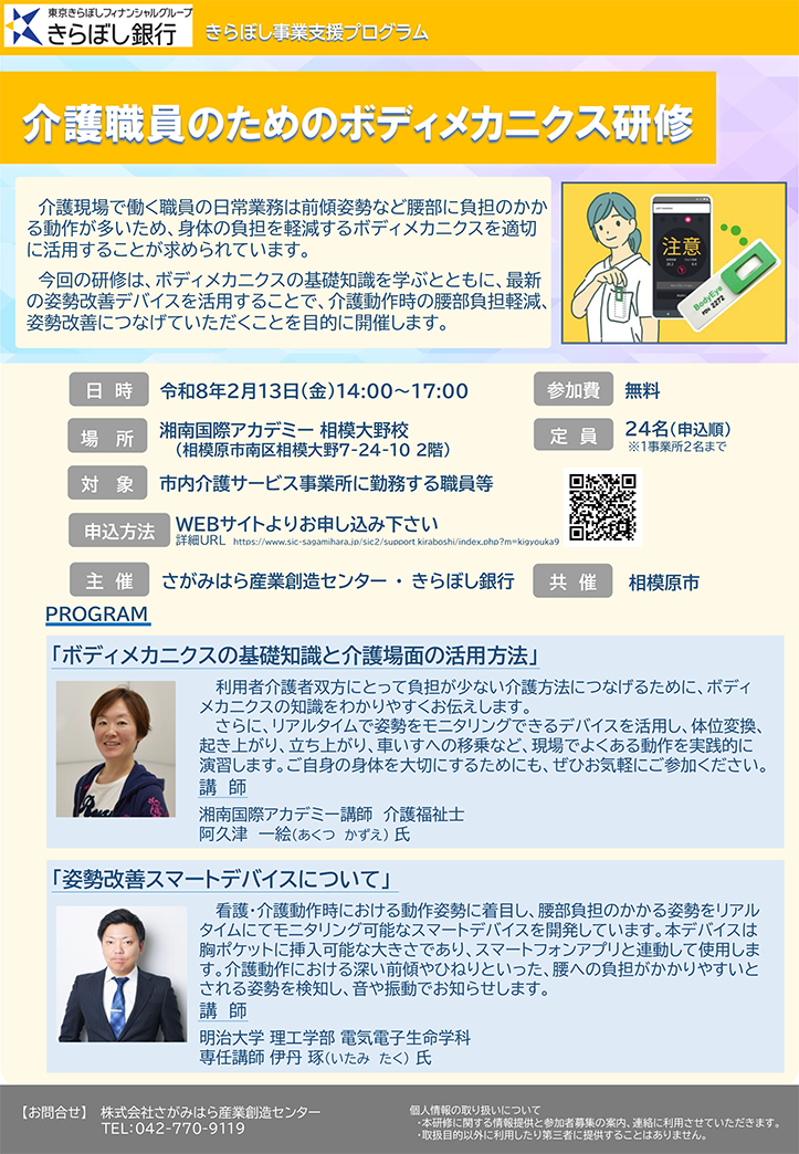 今回の研修は、ボディメカニクスの基礎知識を学ぶとともに、最新の姿勢改善デバイスを活用することで、介護動作時の腰部負担軽減、姿勢改善につなげていただくことを目的に開催します。